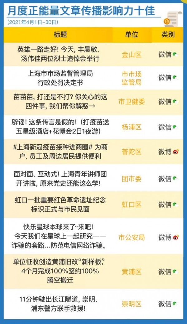 本月正能量十佳稿件中,金山區致敬消防“逆行英雄”;市市場監管局教科書式“行政處罰書”獲網友點贊;市衛健委就新冠疫苗接種問題為群眾解疑答惑,楊浦區及時澄清有關疫苗接種謠言,普陀區發布疫苗接種便民信息;團市委、虹口區圍繞黨史學習教育開展宣傳,營造紅色學習氛圍;市公安局借助名人效應擴大防范網絡詐騙傳播效果;黃浦區公布近期舊改情況,推動精細化管理;崇明區刊發暖新聞,點贊城市正能量,均獲得網上較高關注。