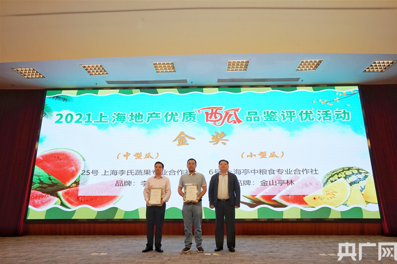 上海亭中糧食專業合作社獲得小西瓜品鑒評優金獎。上海李氏蔬果專業合作社獲得中西瓜品鑒評優金獎。上海市農業農村委員會黨組成員、副主任葉軍平為金獎獲得單位頒獎。