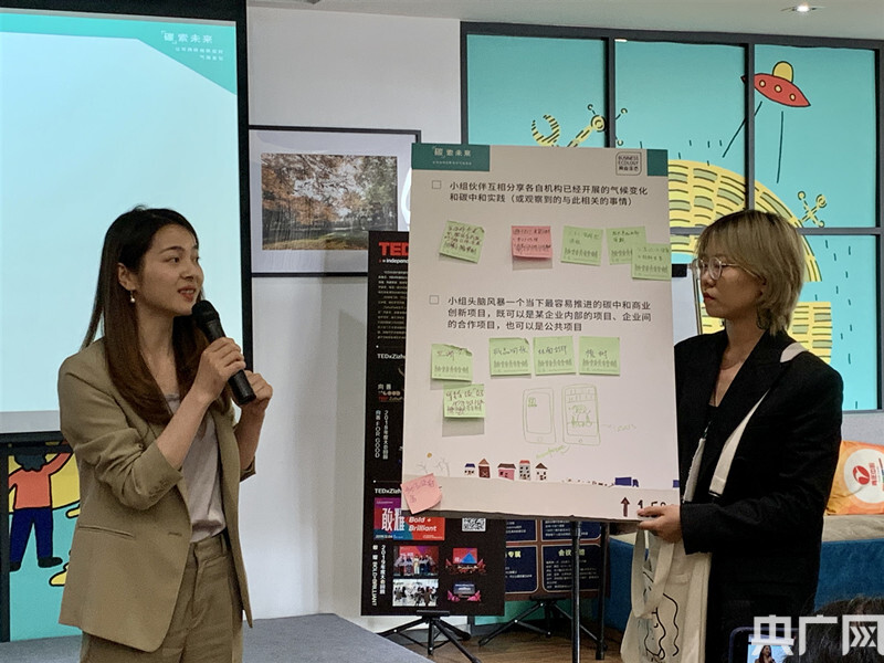 工作坊討論環節,參與者分組頭腦風暴一個具有落地性的碳中和商業創新項目,現場討論氣氛熱烈。有的小組提出了長江入海口牡蠣養殖項目,通過親子教育和社區活動提升公眾參與,出售碳信用等方式,創造社會、環境和經濟三重價值,撬動人們關注海洋固碳能力。有的小組提出建設好物推薦平臺,人們可以通過該平臺找到自己需要的氣候友好的產品和服務,用消費支持可持續發展。還有的小組以其中一個參與者所在的企業需求為基礎,共創了汽車后市場玻璃水小瓶換大瓶的包裝減量改進方案。現場參與者還熱烈地討論了軟塑料包裝與硬塑料包裝的選擇問題。