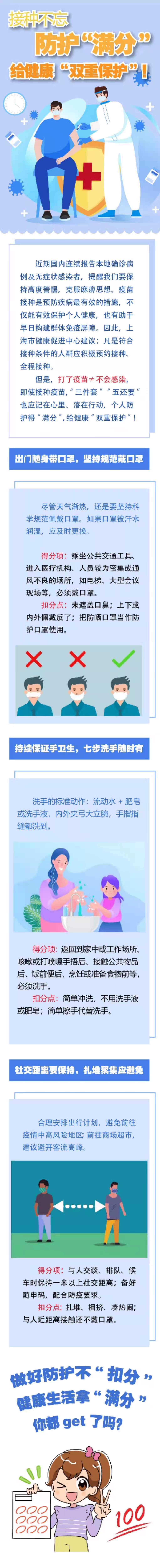 但是,打了疫苗≠不會感染,即使接種疫苗,“三件套”“五還要”也應記在心里、落在行動,個人防護得“滿分”,給健康“雙重保護”!