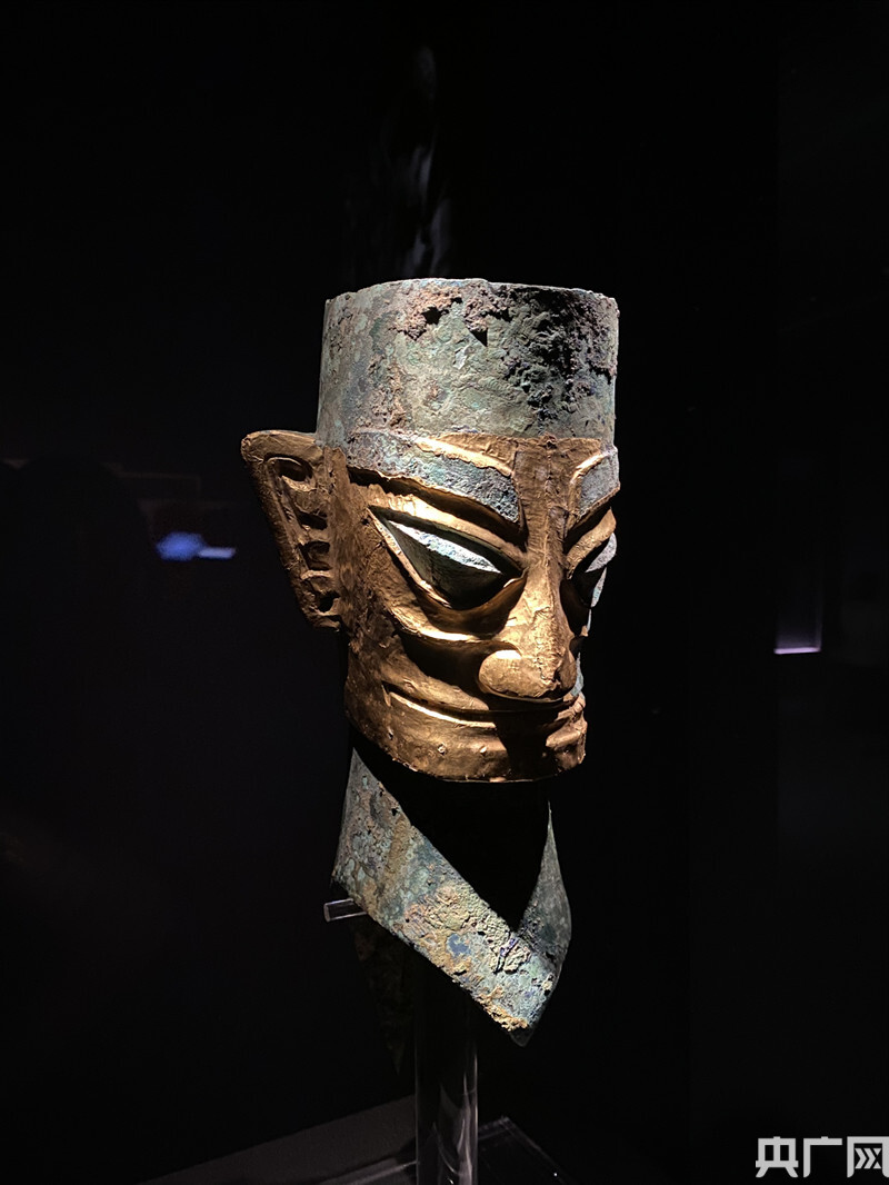 戴金面罩青銅人頭像(央廣網記者唐奇云 攝)