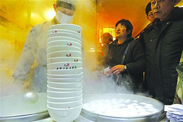據解放網消息 來一碗軟糯香甜的湯圓,祈福新年團圓美滿。臨近元宵,申城老字號湯團店進入一年中最忙的日子。豫園九曲橋邊的“寧波湯團店”,這幾天湯圓的日銷量都超過了7萬只,其中外賣約4萬只;25名員工全員上崗,輪班包制才能滿足顧客需求。閔行“七寶老街湯團店”,要買盒生湯圓,得排隊一個多小時。雖然,如今的湯圓稀奇口味多了,市民的選擇多了,但最熱銷的還是肉餡湯圓和芝麻餡湯圓。