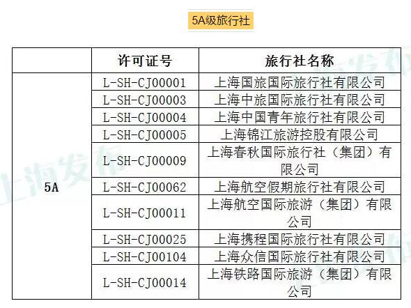 據(jù)上海市旅游局消息,經(jīng)評(píng)定和復(fù)核,本市現(xiàn)有A級(jí)旅行社327家,包括近期評(píng)定的9家4A級(jí)和25家3A級(jí)旅行社。其中上海國(guó)旅國(guó)際旅行社有限公司、上海中旅國(guó)際旅行社有限公司、上海中國(guó)青年旅行社有限公司等10家旅行社被評(píng)定為5A級(jí)。