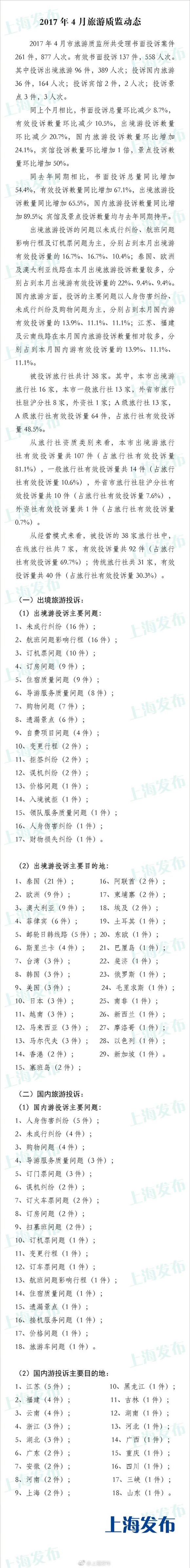 據(jù)上海發(fā)布,公布2017年4月旅游質(zhì)監(jiān)簡(jiǎn)況:出境游中,泰國(guó)、歐洲、澳大利亞旅游線路遭投訴較多,投訴問題以未成行糾紛、航班問題影響行程、訂機(jī)票問題為主;國(guó)內(nèi)游中,江蘇、福建、云南線路遭投訴較多,涉及人身傷害糾紛、未成行糾紛、購(gòu)物等問題。