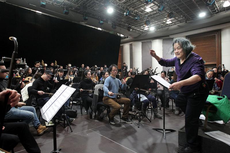 上海民族樂(lè)團(tuán)在湯沐海指揮下進(jìn)行歐洲巡演項(xiàng)目《海上生民樂(lè)》音樂(lè)會(huì)版排練。
