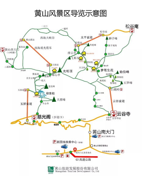 線路3:黃山北大門→松谷庵景觀區→(太平索道上行)→排云亭景觀區→西海大峽谷景觀區(西海觀光纜車)→天海景觀區→光明頂→北海中路→始信峰景觀區→(云谷索道下行)→云谷寺景觀區→黃山南大門