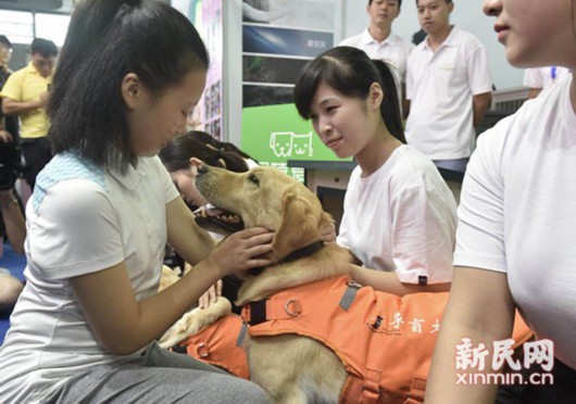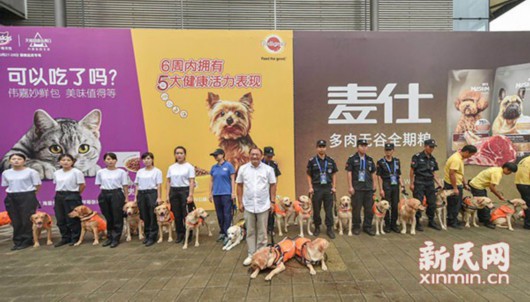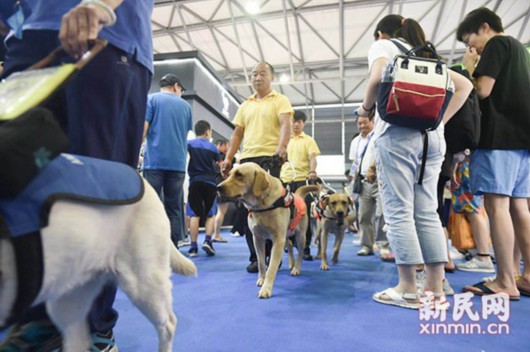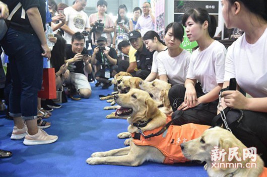 今天上午,二十六條拉布拉多導盲犬現身上海新家國際博覽中心第二十一屆亞洲寵物展現場。