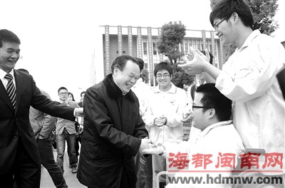 上午9時(shí)許,周其鳳一下車,便與學(xué)生握手,情緒激動(dòng)的學(xué)生紛紛涌向他,索要簽名,而周其鳳接過(guò)學(xué)生的紙筆逐一為他們簽名后,并與學(xué)生擁抱。一位殘障的學(xué)生引起周其鳳的注意,他特地留步勉勵(lì)這名殘障學(xué)生。