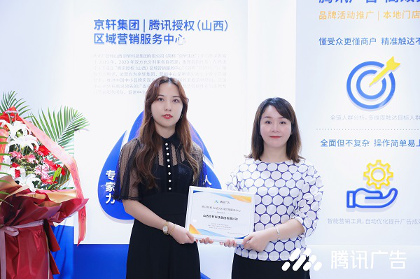 騰訊廣告區(qū)域渠道中心總監(jiān)趙怡向山西京軒科技集團(tuán)有限公司總裁董明頒發(fā)授權(quán)牌照(圖片源自:中國(guó)網(wǎng))
