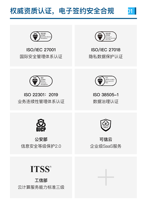 上上簽電子簽約將安全合規與標準遵從融入產品設計與安全運營,持續優化整體安全能力和業務保護水平。據安全白皮書披露,至目前為止,上上簽電子簽約于行業內率先獲得ISO27001國際安全認證、ISO27018隱私數據保護認證、公安部“信息安全等級保護三級”認證、工信部“可信云服務”認證、工信部“云計算服務能力標準符合性評估三級”認證、“ISO 22301:2019業務連續性管理體系”認證,并獲得“英國BSI協會頒發的全球首張ISO38505-1數據治理”認證證書,以七大全球權威安全資質推動行業安全技術門檻不斷提升。