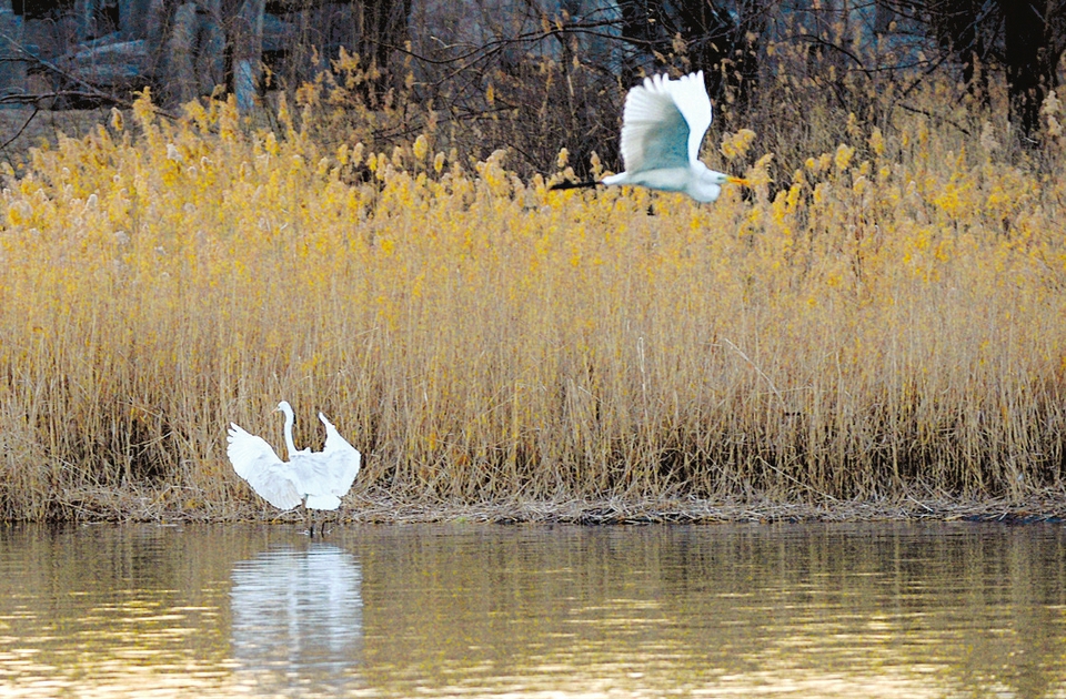 12月6日,黃昏時刻,兩只白鷺正在太原汾河濕地戲水覓食。白鷺是國家二級重點保護動物,近年來,隨著太原汾河水質和周邊生態環境的不斷改善,陸續有近百種鳥類出現在汾河景區,其中不乏有白鷺、灰鸛等國家重點保護動物。連日來,飛臨太原汾河景區濕地越冬的白鷺不時在人們面前亮相。記者 李兆民攝