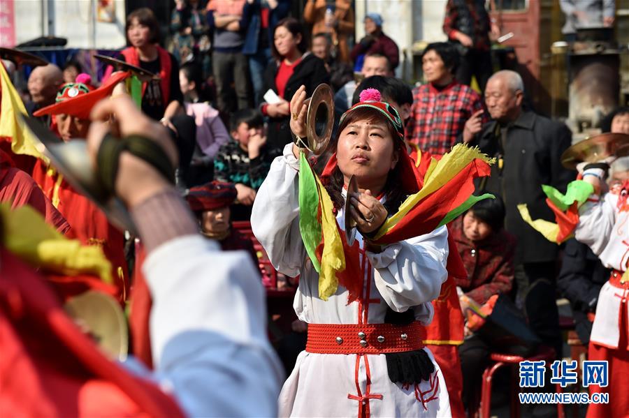 2月27日,在山西省新絳縣陽王鎮,民間社火隊表演絳州鼓樂。當日是農歷二月初二,山西省新絳縣陽王鎮舉行第二屆民俗文化節社火調演活動。民間社火隊在街頭進行抬閣、絳州鼓樂、抬花轎等具有濃郁地方特色的社火表演,迎接新春農事的開始,祈求新的一年風調雨順、五谷豐登。新華社記者詹彥攝