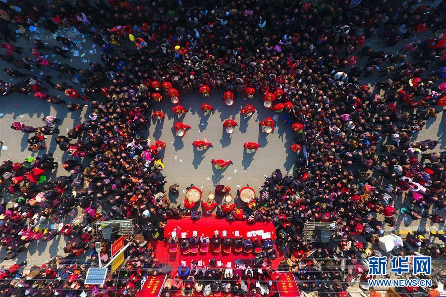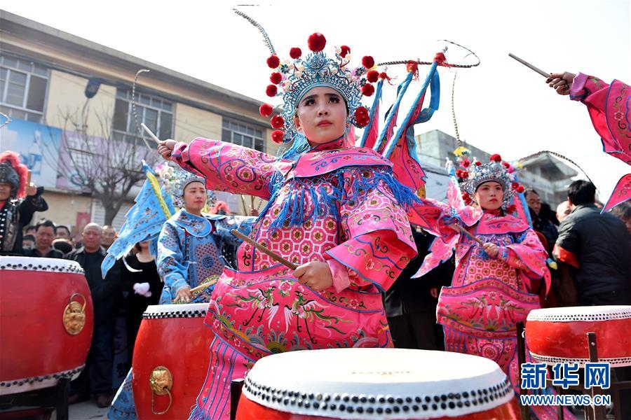 2月27日,在山西省新絳縣陽王鎮,民間社火隊進行花鼓表演。當日是農歷二月初二,山西省新絳縣陽王鎮舉行第二屆民俗文化節社火調演活動。民間社火隊在街頭進行抬閣、絳州鼓樂、抬花轎等具有濃郁地方特色的社火表演,迎接新春農事的開始,祈求新的一年風調雨順、五谷豐登。新華社記者詹彥攝 -