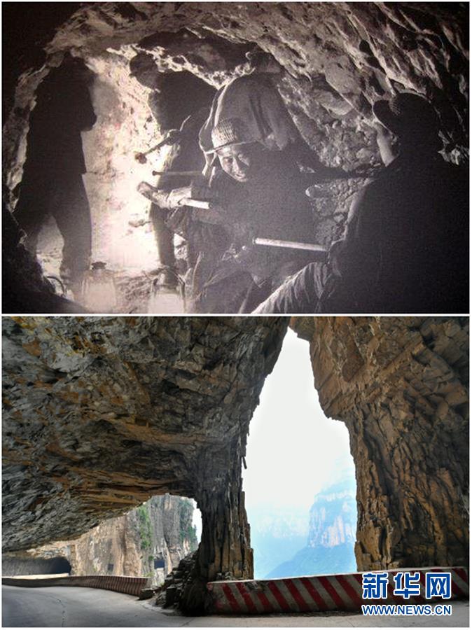 拼版照片:上圖為山西省長治市平順縣神龍灣村村民在修建掛壁公路(資料照片);下圖為山西省長治市平順縣神龍灣掛壁公路(6月13日新華社記者曹陽攝)。新華社記者 曹陽 攝 -