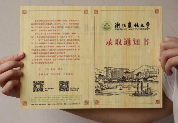 浙江農林大學2015年開始以毛竹為原材料制作錄取通知書,利用刨切微薄竹技術制作印刷錄取通知書,制作工藝運用了8項國家專利,該錄取通知書走紅網絡。