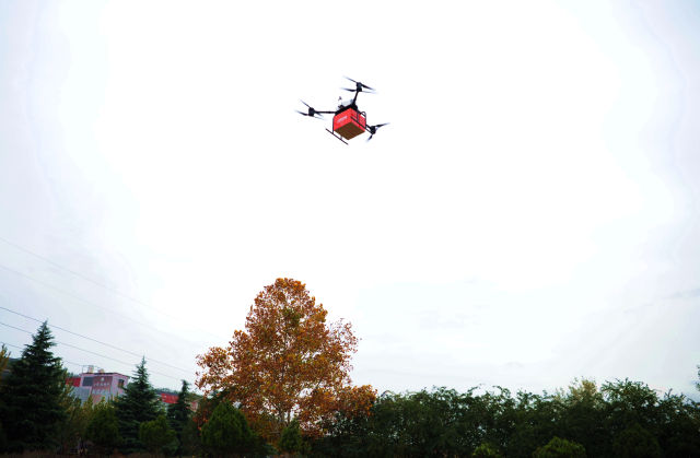 無人機正帶著快遞箱飛往目的地。新華社記者張博文 攝