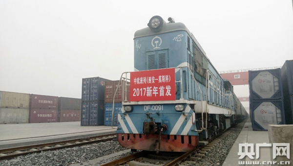 央廣網西安1月1日消息(記者劉濤 通訊員莊敬平 鐘翰林)1月1日上午10時,伴隨著一聲汽笛,2017年首趟西安——莫斯科中歐班列滿載著41車貨物,從西安鐵路局西安西站新筑車站駛出,向著7423公里外的俄羅斯首都莫斯科前進,開啟新一年的旅程。
