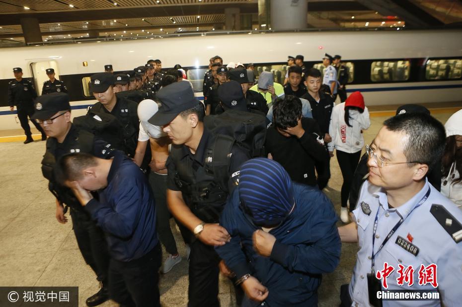 9月4日晚11時許,隨著列車緩緩進站,25名犯罪嫌疑人從哈爾濱押解回西安。據該局相關負責人介紹,押解時間長達一天一夜,為防止嫌疑人自殘或脫逃,押解民警將自己和嫌疑人拷在一起。目前,這25名嫌疑人因涉嫌網絡詐騙,已被公安航天分局立案調查,目前案件還在偵辦中。張杰攝 圖片來源:視覺中國