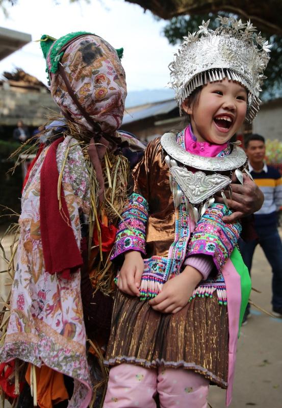 2月18日,在廣西融水苗族自治縣四榮鄉(xiāng)田頭苗寨,一名苗族小朋友(右)在參加民俗祈福活動(dòng)。