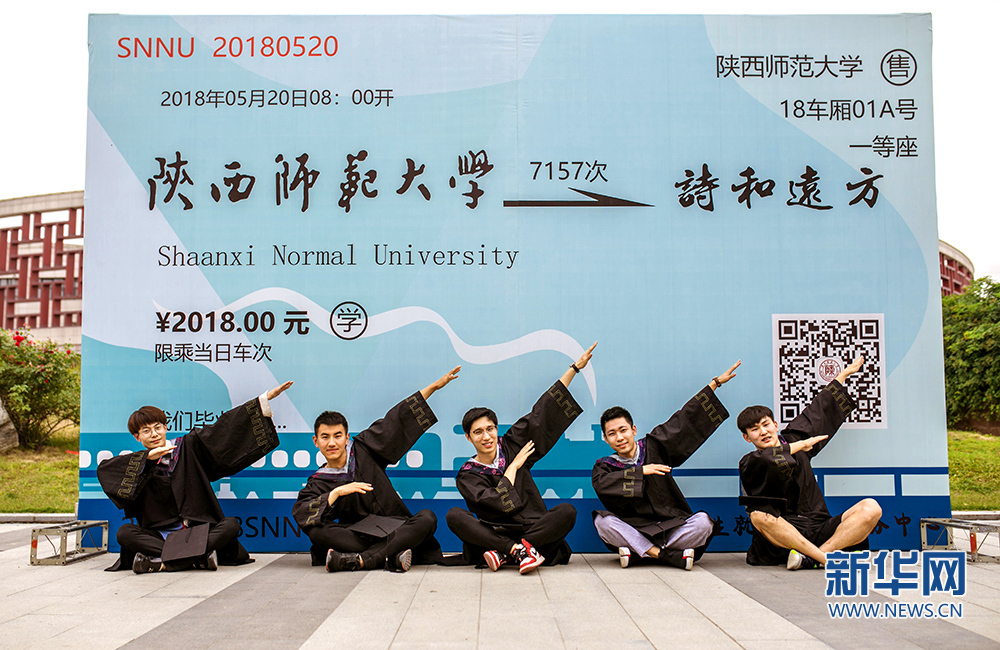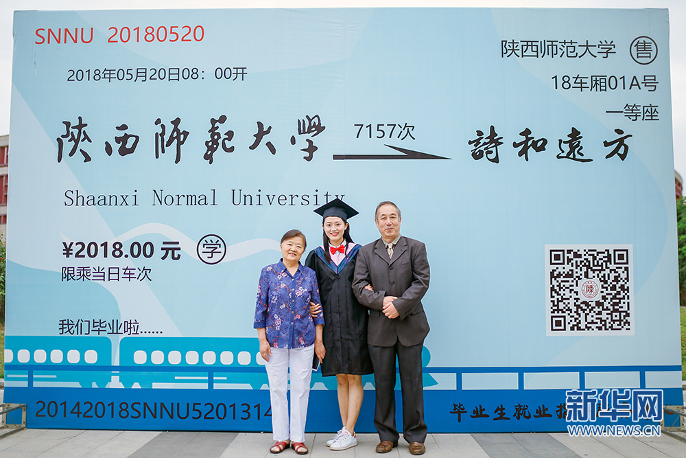 陜西師范大學畢業生帶著家人在校園畢業海報前留影紀念。新華網發 王江川攝 六月的夏季帶著離別的味道,而第一次踏進校園的悸動至今記憶猶新。從軍訓服到學士服,從大學生到“社會人”,是你看著我一點點成長,教導我厚德、積學、勵志、敦行。畢業季悄然來臨,在離開之前,陜西師范大學的畢業生用獨特的姿態與校園合影,留下屬于自己的專屬記憶。(汪艷)