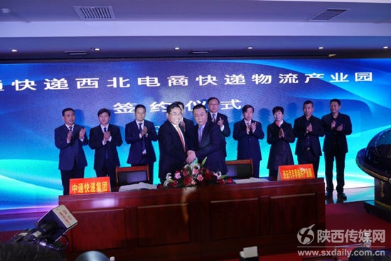 陜西傳媒網訊(記者 何葉)2月27日上午中通快遞西北(西安)電商物流產業園項目簽約儀式在陜西西安舉行。陜西省交通廳副廳長趙雷,西安戶縣縣委書記陸曉延、縣人大主任張閱農、縣長張永潮等當地負責同志應邀出席儀式,中通董事、副總裁王吉雷出席并現場簽約。