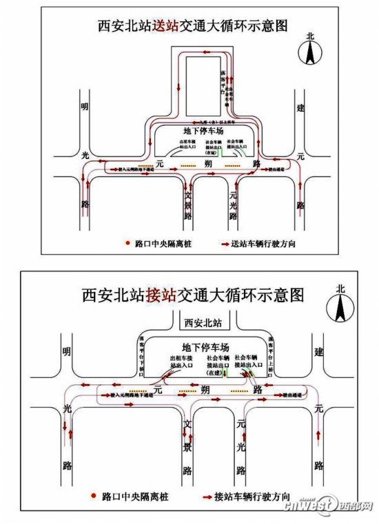 同時在西安北客站外圍制定接送站交通大循環方案:送站大循環線路為文景路(明光路、元光路或建元路)→元朔路→落客平臺上橋口→平臺東匝道出發口→落客平臺下橋口(全部右轉)→元朔路→明光路離開北客站。
