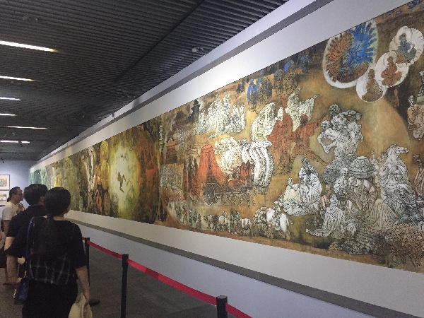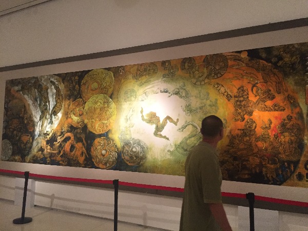 展出作品是否不都是真跡呢?記者立即前往位于曲江的西安美術館,雖然天氣炎熱,但記者發現,來此參觀的市民還真不少,還有不少小朋友前來參觀。不少人在作品前拍照留念。投訴者李先生帶領記者在一、二樓展廳一轉,然后,李先生告訴記者,他發現在二樓展出的畫作“鴻蒙初開”是一樓展出的巨幅“絲綢之路”畫作的部分節選,有高度的相似性。而李先生還講道,以他的作畫經驗,展出的作品有不少就是仿真打印作品。而對于展出作品是否真跡,記者也隨即采訪了幾位市民,大家都表示不可能,“楊老師是大師,怎么可能作品展展示別的?”一位參觀者反問。