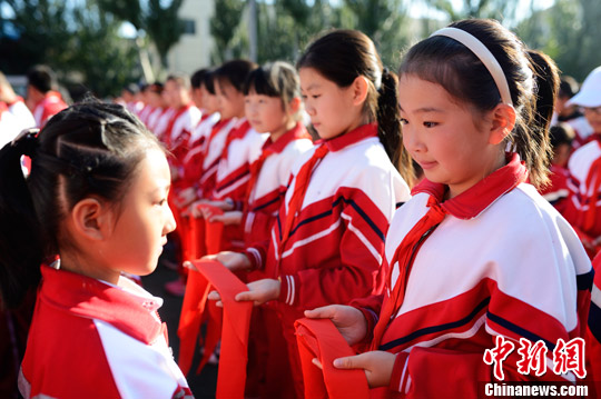 資料圖:某小學(xué)高年級同學(xué)為一年級新生佩戴紅領(lǐng)巾。(圖文無關(guān)) 中新社記者 劉文華 攝