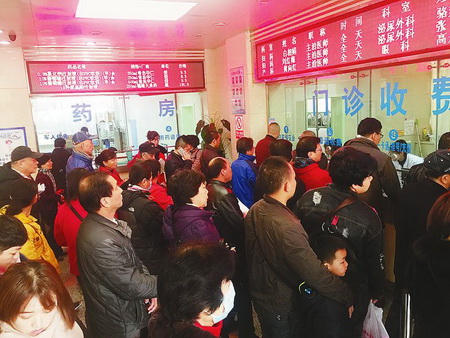 在解放軍第四五一醫院的掛號窗口前,前來就醫的群眾正在排隊。