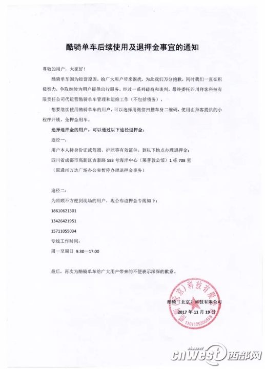 而針對大家關心的退還押金一事,公告稱,酷騎原通州萬達廣場辦公室暫停辦理退押金事務,現場退款只能攜帶用戶本人身份證或駕照、護照等有效證件前往四川省成都市高新區吉泰路588號海洋中心1棟708室辦理。