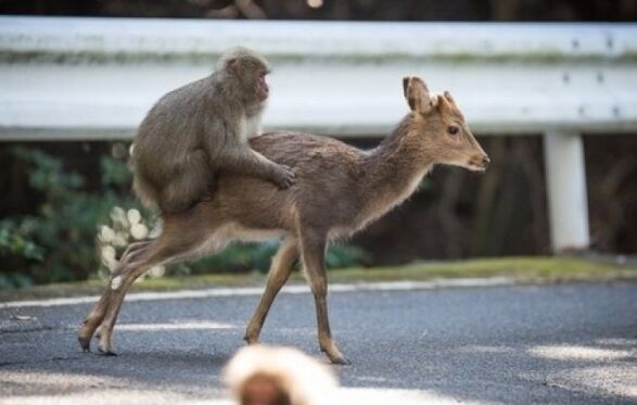 據報道,長期研究日本獼猴生態的兩位法國動物學家蘇厄爾(Cédric Sueur)和佩德羅(Marie Pelé)表示,當地的日本獼猴與鹿,在屋久島居然發展出特殊關系,自然形成奇妙的生態圈。如鹿會吃獼猴扔在地上的種子及大便,獼猴則會幫鹿抓虱子,獼猴甚至騎到鹿的身上四處走,學者還說曾看到獼猴與鹿發生性行為。