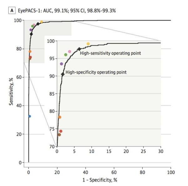 圖 2. 算法性能(黑色曲線)和八位眼科醫生(彩色圓點)在由9963個圖像組成的驗證集上判斷病變,即判斷是否存在可引起的糖尿病性視網膜病變(中度或更嚴重的糖尿病性視網膜病變或可疑的糖尿病性黃斑水腫)。圖上的黑色方塊對應在高靈敏度和高特異性操作點中,算法的靈敏度和特異性。
