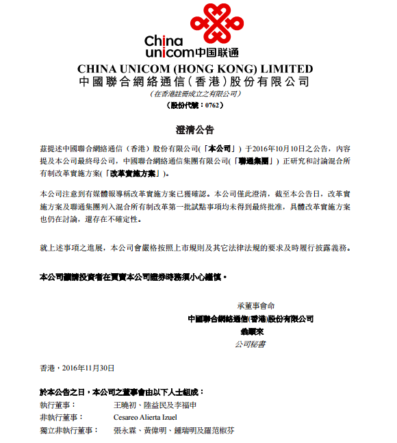 中國聯通11月30日在港交所發布澄清公告稱,混合所有制改革實施方案及聯通集團列入混合所有制改革第一批試點事項均未得到最終批準,具體改革實施方案也仍在討論,還存在不確定性。