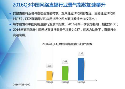 網絡直播行業景氣指數由直播帶寬、觀眾獨立IP和獨立在線、主播獨立IP和同時在線,以及直播網站和應用貨幣化四方面指數綜合加權得出。景氣指數每季度發布,2016年第一季度為基期,指數為100。