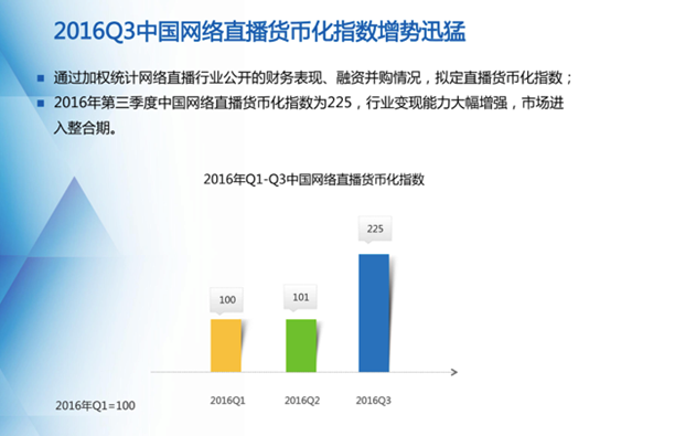 值得注意的是,在今年第三季度,我國網絡直播行業的變現能力出現大幅增強。《中國網絡直播行業景氣指數報告》顯示,2016年第三季度中國網絡直播貨幣化指數為225,環比增長122.8%。中國信通院研究院政策經濟研究所主任何偉表示,“當前,我國互聯網直播的內容和形式呈現出多元化探索的特征,網絡直播與各行業業態之間的融合加深,直播+爆發出強大的生命力,這種融合不僅是我國產業融合創新的重要體現,也是直播平臺未來拓寬變現模式的主要方向!