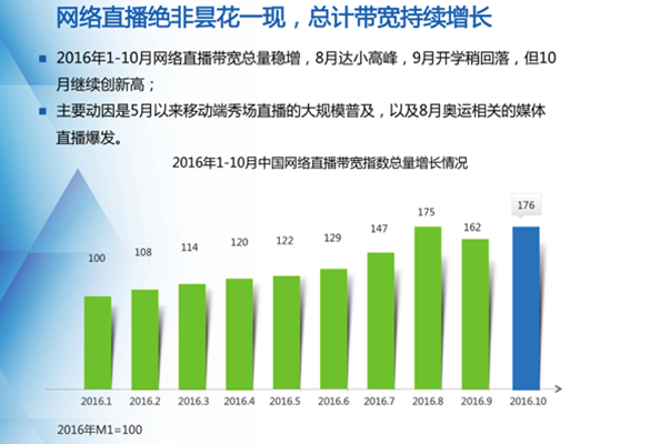 具體來看,前三季度網絡直播帶寬指數持續增長,以第一季度為基數,二季度、三季度帶寬指數分別為116、150,呈現出加速上漲的態勢。從月份上來看,2016年1-10月網絡直播帶寬總量穩增,8月達到小高峰,9月開學稍回落,10月繼續創新高。主要動因在于5月以來移動端秀場直播的大規模普及,以及8月奧運相關的媒體直播爆發。
