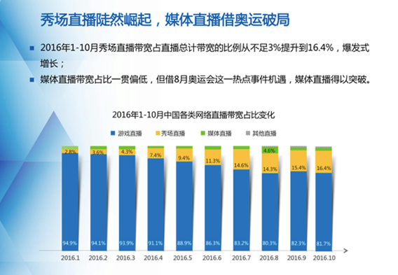 從不同類型直播的帶寬占比來看,2016年1-10月秀場直播帶寬占直播總計帶寬的比例從不足3%提升至16.4%,實現爆發式增長,相比1月,10月秀場直播帶寬指數已增長超9倍;媒體直播帶寬占比一貫偏低,但借8月奧運會這一熱點事件機遇,媒體直播得以突破;游戲直播帶寬總量穩定增長,借暑假和十一假期保持加速增長勢頭。