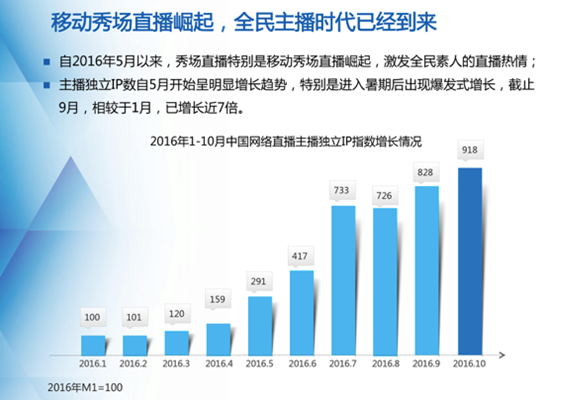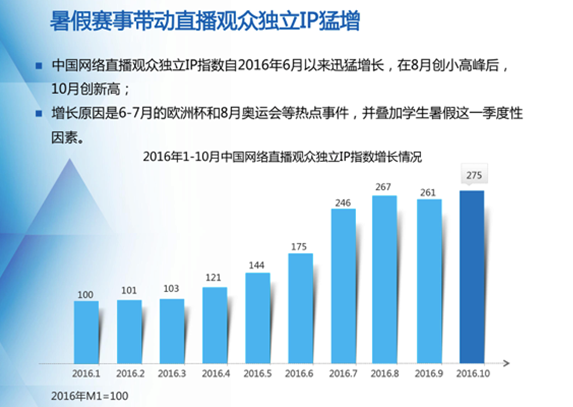 從中國網絡直播觀眾方面來看,觀眾獨立IP指數自2016年6月以來迅猛增長,在8月創小高峰后,10月創新高,增長原因在于6-7月的歐洲杯以及8月奧運會等熱點事件,并疊加了學生暑假這一季度性因素。