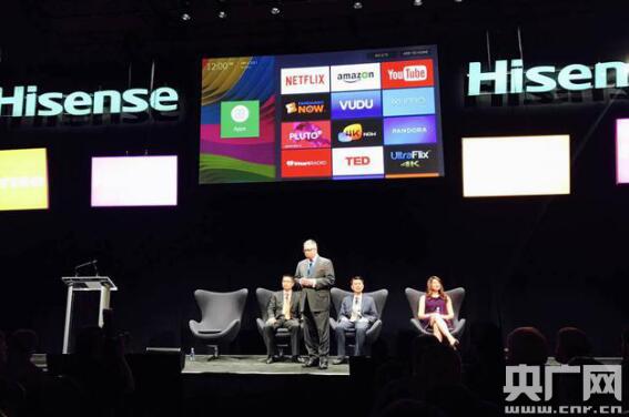 中國家電廠商海信(Hisense)在CES消費電子展商發(fā)布會雙色4K激光電視新品。