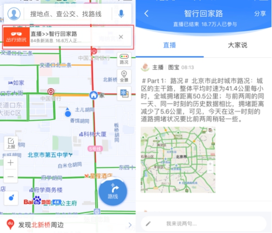 直播過程中,用戶可以很方便地進入直播間:打開百度地圖APP,可以看到頁面最上方的“智行回家路”直播入口提醒,點擊后即可進入直播間,有直播主持人“圖寶”隨時為大家更新路況信息,例如上午8點13分,圖寶對北京市城區路況做了及時播報,信息顯示主干路整體平均時速為41.4公里每小時,全城擁堵距離50.5公里等,為即將出城用戶提供最強參考。