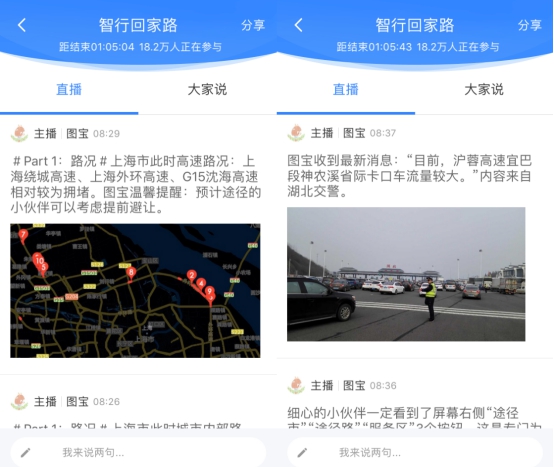 為幫助廣大用戶順利踏上返鄉路,百度地圖于1月21日早上8點及時上線了“智行回家路”直播間,提供包括全國城市路況、高速路況、人流遷徙、熱力圖、熱門自駕路線等全方位交通及安全信息。截止到13時直播結束,短短5個小時內,直播間發布全國各地重要出行信息上百條,共有18.7萬人涌入直播間查看相關信息,引發用戶討論近2000條。