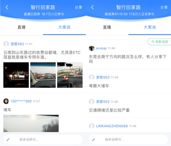 除了在百度地圖“智行回家路”直播間查看權威交通信息發布,每一位用戶也可以在“大家說”版塊兒發布消息,分享自己周邊的路況或突發事故給他人提供參考,群策群力讓春節返鄉更暢通、更高效。
