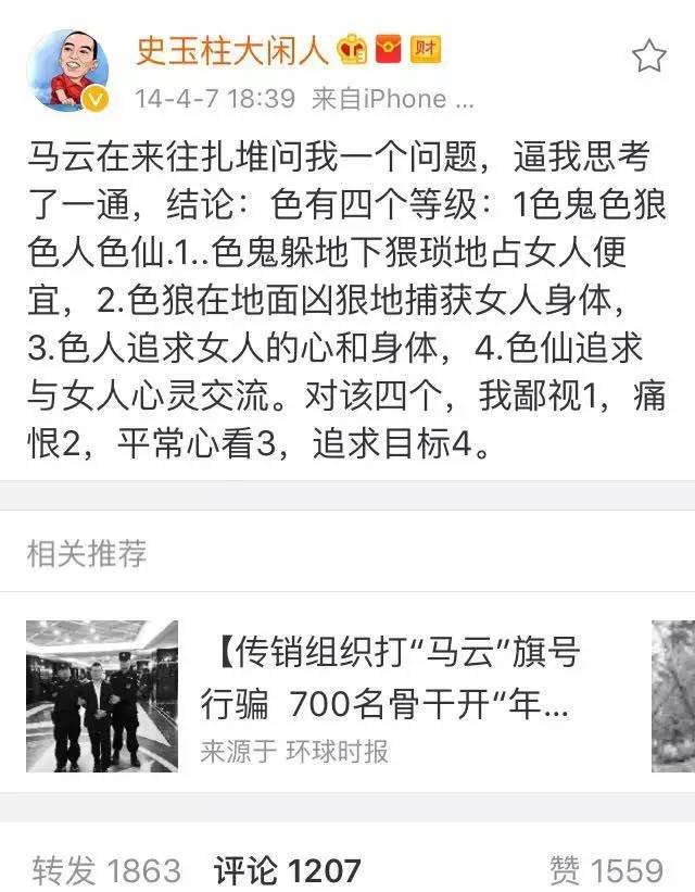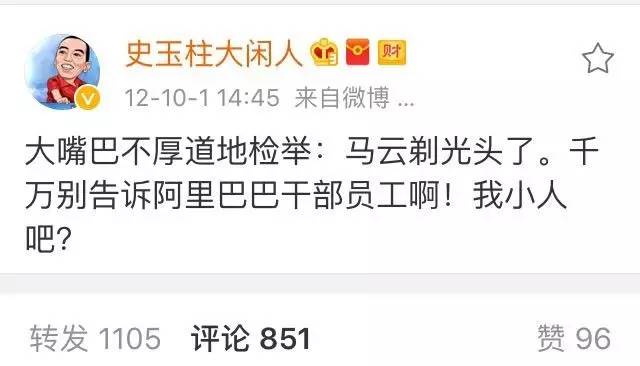 但是有一個人,和他的關系并非一般的好。這個人是史玉柱,據說2012年馬云剃光頭是受了史玉柱的影響,當時,史玉柱還在 調侃了一下馬云。
