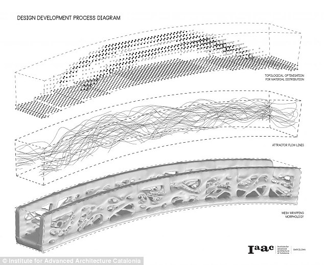 加泰羅尼亞高等建筑研究院負責整座橋的設計,設計團隊負責人 Areti Markopoulou表示:“傳統建筑建造過程不可避免地存在大量材料浪費,但3D打印技術可以控制材料的使用! “通常情況下,我們受制于簡單的建筑幾何圖形,因為制造復雜的模具十分復雜費錢! “但在建造這座橋時,我們能用復雜但似乎自然天成的模具進行實驗,并且能夠設計出用傳統方式無法完成的建筑圖形。”