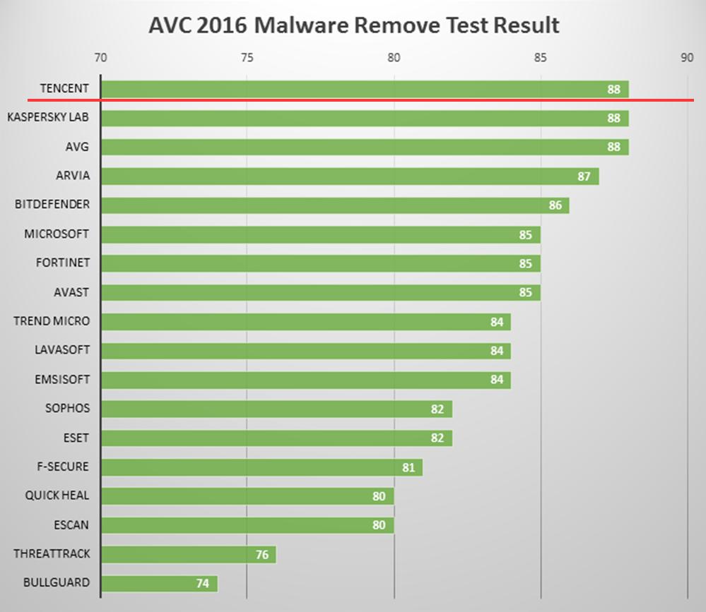 同時,值得一提的是,清除測試系騰訊電腦管家(英文版)2016年首次參測的項目,在和卡巴斯基、AVG等國際知名殺軟的同場競技中,騰訊電腦管家(英文版)憑借自研殺毒引擎TAV,以出色的清除能力取得最高分,與卡巴斯基、AVG并列排名世界第一,榮獲“A+”最高評級。觀察清除測試結果還可以發現,在18款參測的殺毒軟件中,騰訊電腦管家是唯一一個登榜的國產殺軟品牌,這代表著國產殺軟在惡意文件清除能力上已經到達了世界領先水平。