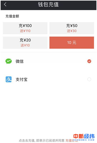 中新經緯客戶端(微信公眾號:jwview)在摩拜APP充值頁面進行親測,但并未找到無所謂的“1元起充”入口,頁面設置充值金額分別為10元、20元、50元和100元。
