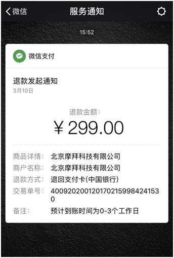 10日,針對用戶和媒體質疑,中新經緯客戶端(微信公眾號:jwview)獨家向摩拜單車方面進行了求證,涉及退款難、客服忙、人身保險等問題。其中,就押金退款難問題,摩拜方面表示,目前用戶押金已經可以實現秒退,設置2到7天是根據微信和支付寶等付款通道提現時間。中新經緯客戶端(微信公眾號:jwview)親測發現,點擊“押金退款”的確瞬間退款成功。押金額按照原付款通道微信支付-信用卡返回,但仍需0到3個工作日。