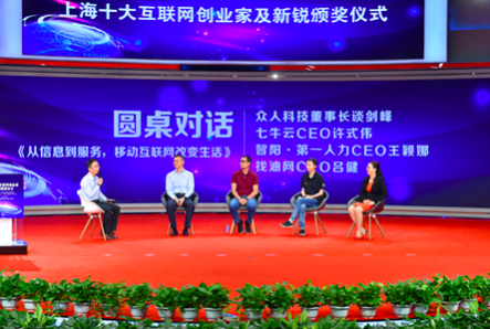 圓桌對話環(huán)節(jié),人民網(wǎng)上海分公司總經(jīng)理金煜純攜手眾人科技董事長談劍峰、七牛云CEO許式偉、智陽.第一人力CEO王穎娜、找油網(wǎng)CEO呂健等嘉賓就“從信息到服務,移動互聯(lián)網(wǎng)改變生活”主題進行了探討。