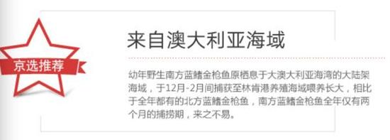 6月9日,京東宣布“將世界頂級(jí)食材———澳洲冰鮮藍(lán)鰭金槍魚(yú)引進(jìn)國(guó)內(nèi)”,而且京東在給媒體的通報(bào)中一再?gòu)?qiáng)調(diào),“京東生鮮在售的藍(lán)鰭金槍魚(yú)均為人工養(yǎng)殖金槍魚(yú),并非野生捕撈。供應(yīng)商為澳大利亞百斯頓集團(tuán),其擁有澳洲最大的金槍魚(yú)養(yǎng)殖基地,在澳洲屬于政府支持的合法產(chǎn)業(yè)。”