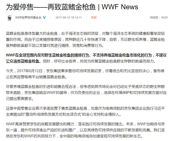 12日晚,世界自然基金會(huì)(WWF)官微發(fā)布《為愛(ài)停售——再致藍(lán)鰭金槍魚(yú)》,對(duì)京東停售藍(lán)鰭金槍魚(yú)進(jìn)行了贊賞: